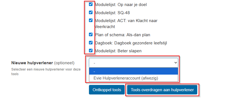 Kies de tools die je wilt overdragen aan je collega's, selecteer de betreffende (gekoppelde) collega en klik op "Tools overdragen aan hulpverlener"