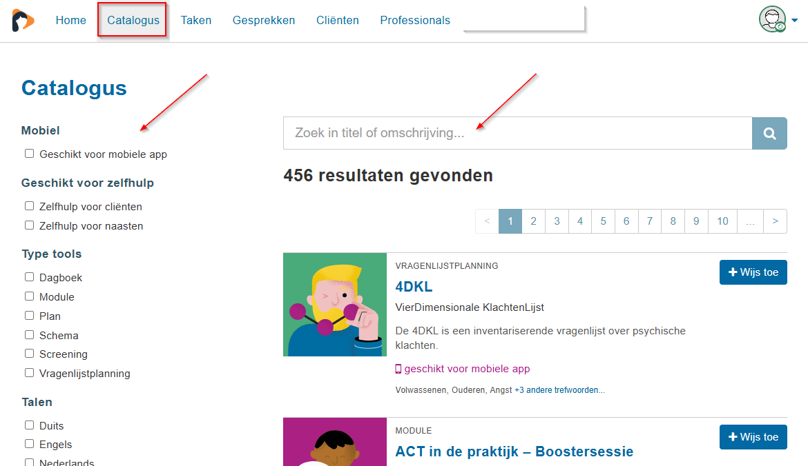 Onder de tab 'Catalogus' kun je zoeken welke tools beschikbaar zijn voor jullie platform. Je kunt hier als hulpverlener kiezen uit allerlei ondersteunende tools. Ook kan een patiënt zelf aan de slag met online zelfhulp. Zo heeft ieder patiënt een eigen aanbod, passend bij zijn of haar klachten.