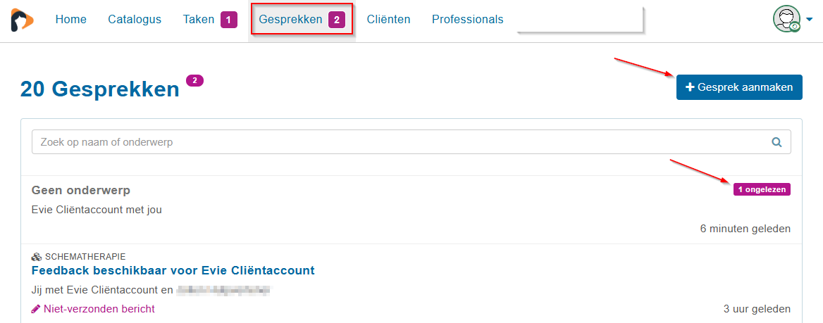 Onder "gesprekken" vind je een overzicht van alle gesprekken die je hebt in het platform. Ongelezen berichten kun je herkennen aan de "ongelezen" tag.