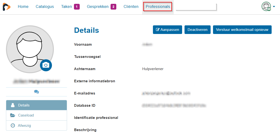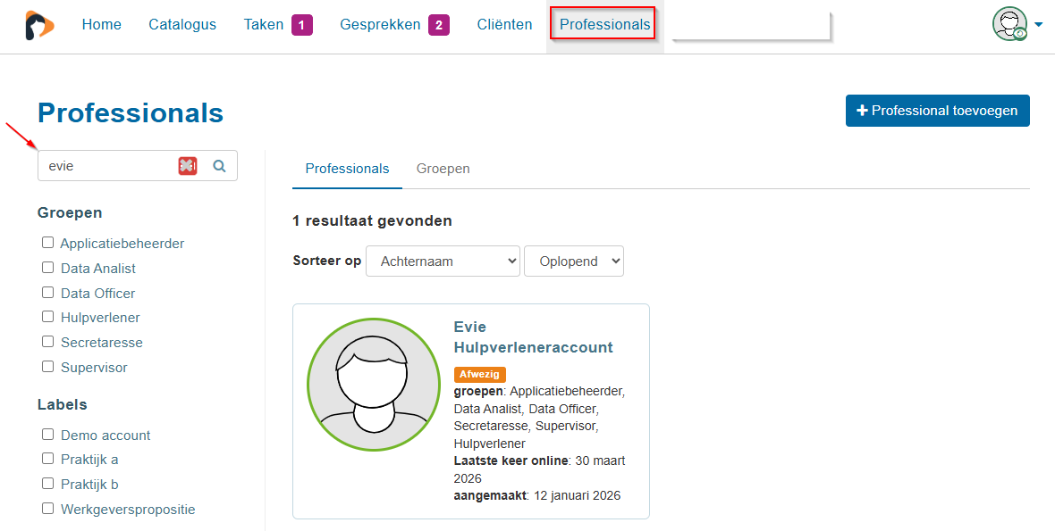Onder de tab 'Professionals' vind je de professionals die aan het platform zijn toegevoegd.