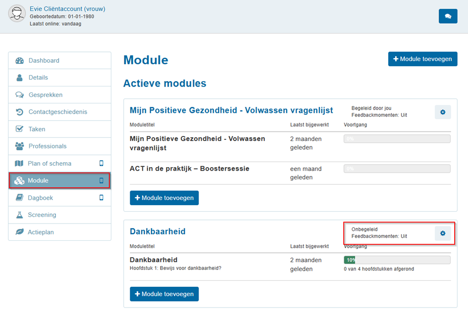 Het is als hulpverlener wel mogelijk om de modules in te zien. Ze staan in het cliëntaccount onder “Modules”. De modules zijn dan onbegeleid. Je hebt, indien gewenst, de mogelijkheid om de modules begeleid te maken en de feedbackmomenten aan te zetten. Je kunt dit doen door op het tandwiel-icoontje te klikken.