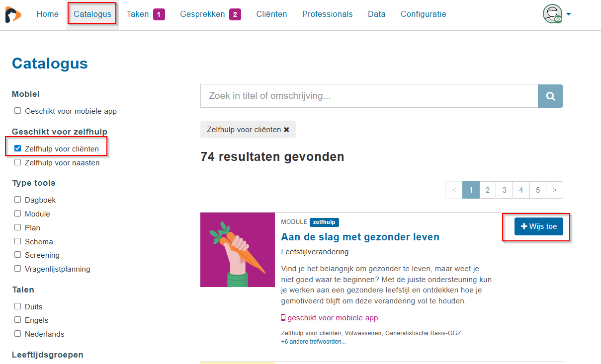 Je kunt als hulpverlener ook zelfhulpmodules toewijzen aan de cliënt. Je hebt in de catalogus de zoekfilter 'Geschikt voor zelfhulp'. Als je als hulpverlener een zelfhulpmodule toevoegt, word je de begeleider van de module.